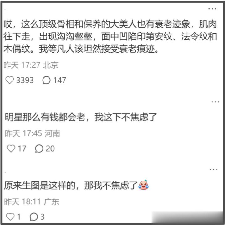 值得一提的是,如此真实且衰老的高圆圆也在一定程度上缓解了大部分网友的容貌焦虑,原来,哪怕是顶级骨相且保养得宜的大美人也会肌肉往下走,脸上出现沟沟壑壑,面中凹陷,脸上布满印第安纹、法令纹和木偶纹,那么普通人又何必为老去而焦虑呢?