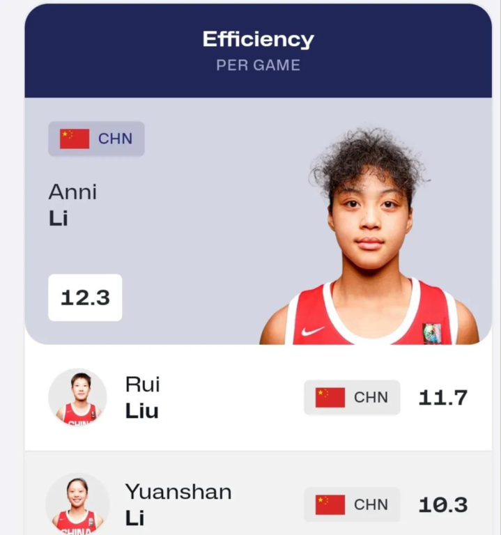 第一,李安妮效率排在全队前列,根据fiba官方统计的数据,李安妮效率值为12.3排,在全队第一位,李沅珊的效率值为10.3,比李安妮低了2个点。