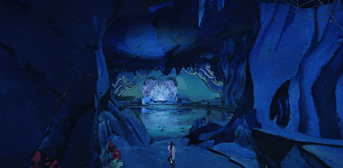 想较于葫芦爷爷家祥和静谧的场景,妖怪的洞府则走向了另一个极端,色彩阴冷,怪石遍布,怪诞之感尽显,不知道大家小时候都有没有被妖精们吓到,这个场景做出来的效果确实有内味儿了。