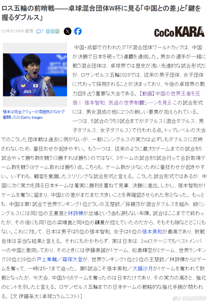 伊藤条太在采访中说道:2028年洛杉矶奥运会首次引入了混合团体的形式取代了男子团体与女子团体,所以2025年混团世界杯就是洛奥的前哨站,这是奥运会史无前例的变革,日本在今年首次冲入决赛,但15盘取8分的比赛日本队只有张本智和拿到1分,可以说日本队在决赛中是一边倒的态势惨败中国队。