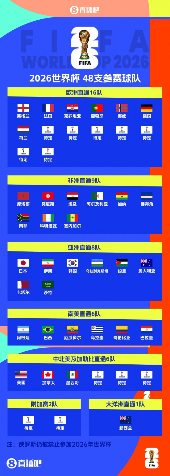 直播吧11月18日讯世欧预小组赛结束多场对阵,德国、荷兰均取得大胜,两队成功晋级美加墨世界杯正赛。至此,2026世界杯直通名额已经确定34席,还剩14席。